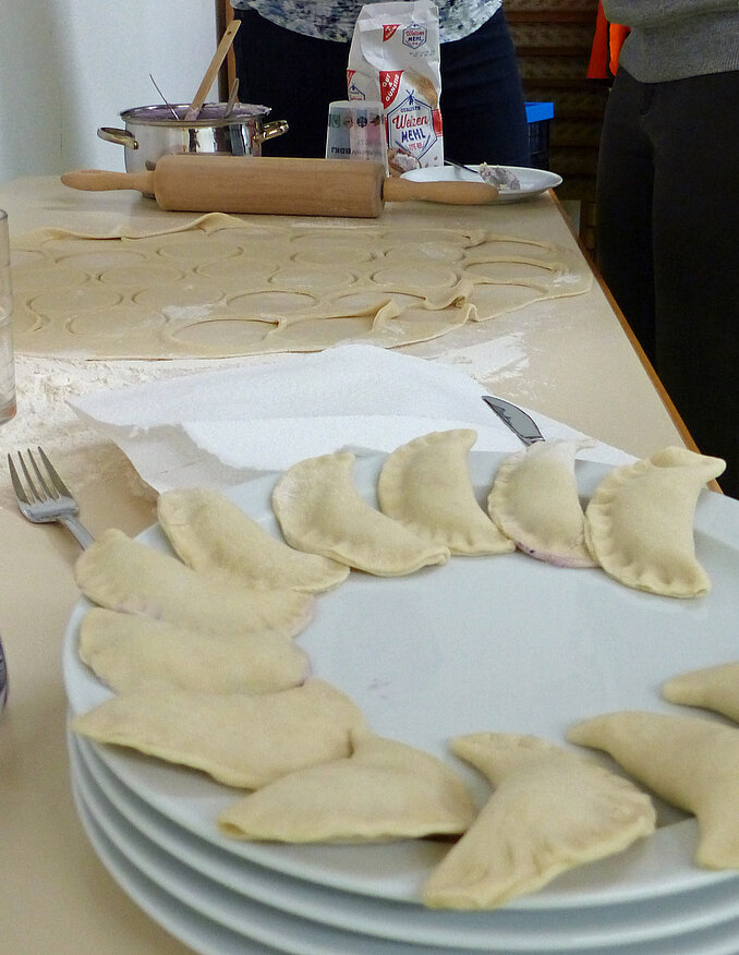Den Nachtisch bereitete Tobi Steiger, der neue Bundesfreiwilligenbedienstete zu. Er kochte Pierogi nach einem polnischen Rezept. Das sind Teigtaschen mit einer herzhaft süßen Heidelbeer-Frischkäse Füllung.
