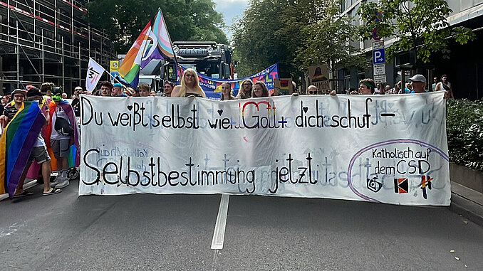 Der Monat Juni stand auch dieses Jahr ganz im Zeichen queerer Menschen und ist daher auch als Pride Month bekannt. In Stuttgart fand der Höhepunkt der Aktionen mit dem Christopher Street Day (CSD) am 29. Juli 2023 statt. Auch wir, die Kolpingjugend DVRS, waren zusammen mit der KJG und Out-in-Church an diesem Tag vertreten. Unter der Wagen-nummer 53 haben wir uns mit tausend anderen Menschen für die Rechte der LGBTQIA+ Community eingesetzt und ein Zeichen gegen Diskriminierung und Übergriffe gesetzt. Dieses Jahr lautete das Motto „Nicht mit uns! Gemeinsam sicher und stark“.