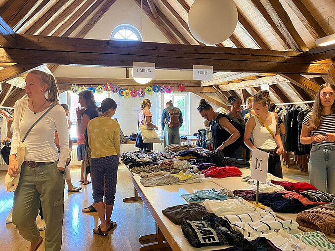Nachdem die letzten beiden Jahre der Kleidertausch wegen Corona ausfallen musste, war es am 9. Juli endlich wieder so weit. Das Leupolzer Gemeindehaus war zum zweiten Mal mit vielen Tauschbegeisterten gefüllt. Besucher*innen allen Alters nutzten die Gelegenheit, um ihren Kleiderschrank von nicht mehr getragenen Kleidungsstücken zu befreien.