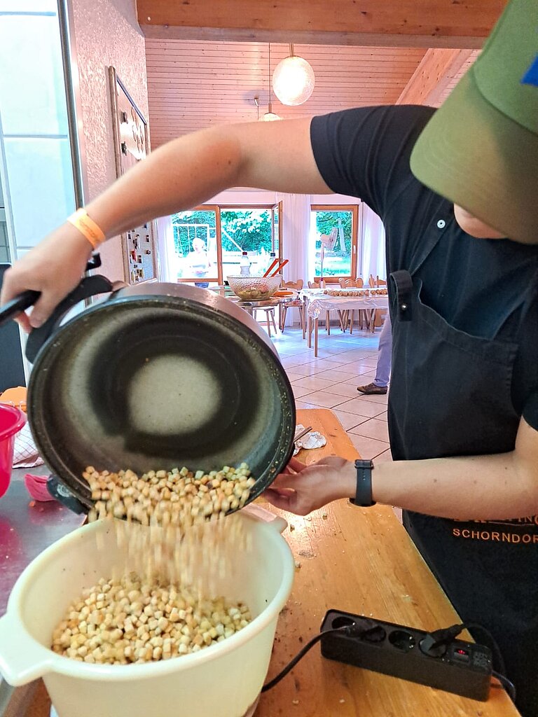 Der Renner bei uns: die „Wurschtknepfle“ – selbstgemachte Knödel, in Brühe serviert. Dafür verwandelt sich unser Kolpinghaus jedes Jahr für zwei Tage in eine lange Produktionsstraße. Vom Anrösten des Brots über das Formen bis hin zum Vorkochen läuft alles Hand in Hand, bis die Knödel in der Kühltruhe landen und schließlich über den Tresen gehen dürfen.
