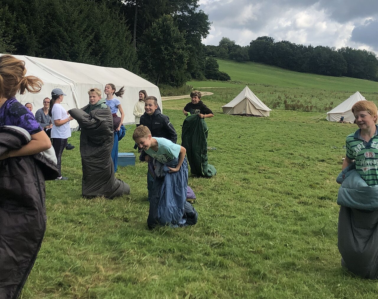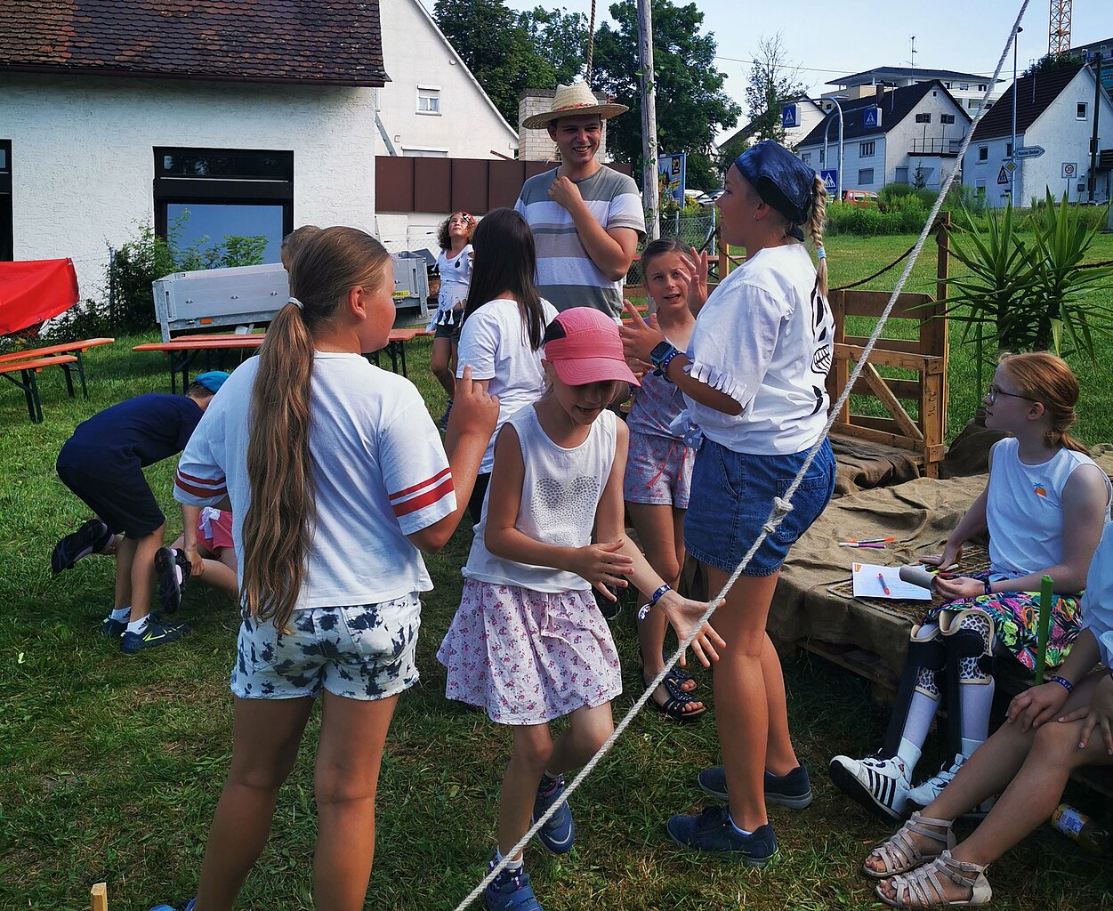 Los ging es bei der KJ Waldstetten, die jedes Jahr zu Ferienbeginn ein großes Zeltlager für Kinder zwischen neun und 15 Jahren veranstaltet. Dieses Jahr stand es unter dem Motto „Wickie und die starken Männer“. Mutig nahmen die 41 Teilnehmer*innen die Herausforderung an und stellten sich bei unserem Besuch der Wette gegen den DAK. Insgesamt 25 Aufgaben mussten innerhalb von 60 Minuten gelöst werden. Dazu gehörten Steintürme bauen, Elfmeter schießen, Frisuren machen oder Kleidung verkehrt herum anziehen… egal welche Aufgaben sie erwarteten, sie meisterten alle mit Bravour und der DAK musste sich geschlagen geben. Der Preis: eine Runde Eis für alle.